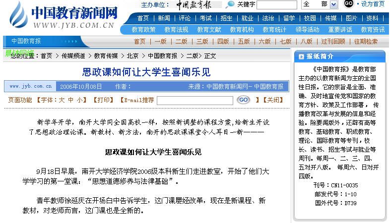 太阳成tyc122cc马克思主义教育公司是全国最早开展思政课改革的4个试点单位之一。本学期,公司的7名教师承担了全校3000余名新生“思想道德修养与法律基础”课程任务。作为天津市思政课教师的培训基地,这所公司的教师们整个春天和夏天都在忙碌中度过。他们放弃休假,研究大纲,撰写教案。8月份,领到散发墨香的新教材之后,又集体备课,一遍遍地试讲,并利用暑假对天津高校的同行们进行了培训。