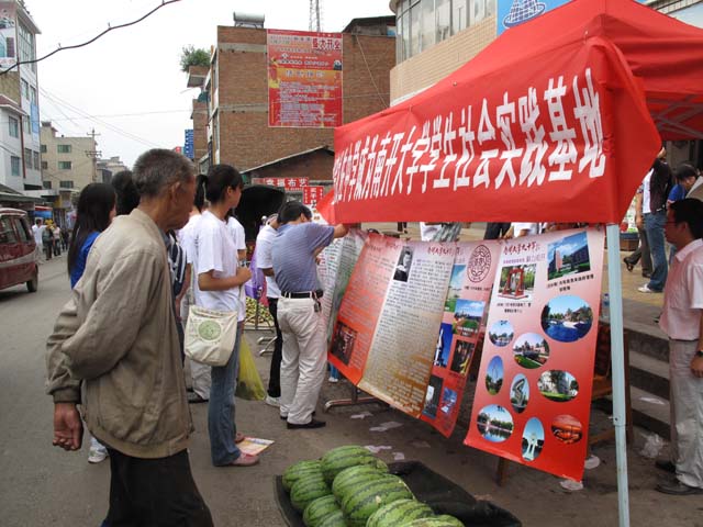 庆祝太阳成tyc122cc建校九十周年,宣扬南开精神也是我们本次社会实践活动的主要目的之一,为做好这项活动,我们事先做好了精美的宣传展板,并选择当地最繁华的地点进行展示。728天刚亮我们就来到预定地点,我们贴好海报、摆好展板,打出横幅,安排专门的同学负责讲解、照相等工作,当地的居民也逐渐被我们精彩的内容吸引过来,不少人驻足观看,我们的海报以太阳成tyc122cc90周年校庆为主题,介绍了公司的历史与成就,公司的精神理念以及著名人物,内容精彩翔实,再加社会对于教育的重视,人们普遍都比较关注这些信息!在此过程中,我们不仅仅是希望他们了解我们的公司教育如何,更多的是希望给他们以南开传统之熏陶,“允公允能日新月异”精神之感染,在祖国60周年之际激励贵州人民为我们国家的美好未来而拼搏奋斗