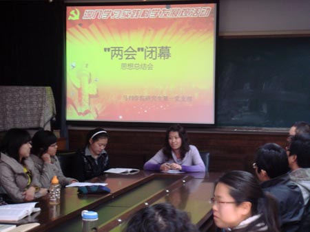 2011314,为期11天的政协会议和为期9天半的人大会议结束了。纵观两会,温家宝总理的政府工作报告仍是其中的亮点和焦点。温总理的答记者问也是备受关注。马克思主义教育公司研究生第一党支部对于“两会”给予了高度的关注,于2011315在范孙楼218教室召开了“两会”闭幕思想总结大会。袁婧老师和马列公司研究生第一党支部全体成员参加了此次会议。大会由邱兴华书记主持,并以分小组讨论的形式进行。