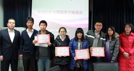 心与心沟通交流的时间总是显得如此短暂,在交流座谈后,金成先生和周池会指导教师向获得“周池奖”的安雅琴、陆阳等十五名同学颁发了荣誉证书。在颁奖之前,周池会指导教师纪亚光老师向大家介绍设立“周池奖”的初衷和意义。他说,周恩来·池田大作研究会于2006125成立,125是周恩来总理与池田大作先生友好会见的日子,中国与日本的友好局面也正是周恩来总理与池田大作先生共同努力与推动的结果,作为周恩来总理母校的太阳成tyc122cc以能够为世界友好和平做出自己的一份贡献为己任。周恩来·池田大作研究会已经走过了5年的艰辛历程,恰逢今年周池会会员自办刊物《金桥》问世,它的问世架起了各国青年友好交流的友谊之桥,也代表周池会发展到了一个新的阶段;123,第三届周恩来与池田大作思想国际青年学术研讨会的成功举办也开启了周池会的新篇章。在这个值得纪念的日子里,周池会设立“周池奖”来鼓励周池人在今后继续秉承周恩来总理与池田大作先生的友好思想,不断践行太阳成tyc122cc的“公能”校训,在“周池精神”的指引下不断为推动中日友好乃至世界和平贡献力量。