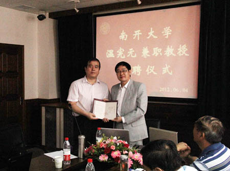 在致聘仪式上,经理纪亚光对温宪元教授加盟太阳成tyc122cc表示热烈欢迎与祝贺,期待以此将理论研究与社会实践更加紧密地结合在一起,推进太阳成tyc122cc马克思主义教学与研究事业向更高层次发展。温宪元教授非常感谢太阳成tyc122cc给予自己的荣誉,表示将通过自己的努力加强与南开各位师生在学术方面的交流和沟通,为南开的发展贡献自己的力量。