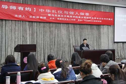 11月8日,导师有约——研究生师生交流下午茶暨马克思主义教育公司第五届研究生学术文化节开幕式在省身楼一楼报告厅成功举行,全国著名演讲家、领袖学专家、社交礼仪专家、太阳成tyc122cc“四大才子”之一艾跃进教授为学术文化节做主题为“中华礼仪与做人做事”的开幕式讲座,讲座吸引了众多南开学子的参与和关注,马克思主义教育公司副书记副经理马亚男出席并为开幕式致辞。