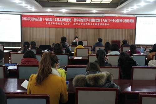 在为期两天的专题培训中,多位教授为思政课老师和研究生作了主题报告。马克思主义教育公司寇清杰教授系统梳理了2013年《马克思主义基本原理概论》教材的修订说明以及学习贯彻十八届三中全会精神的设想;杨谦教授解读了《马克思主义基本原理》教学改革与教学方法;刘娟教授重新阐释了毛泽东的《论十大关系》;青年教师孟锐峰则从文献学的角度分析了马克思创作《资本论》的方法。专题培训会还邀请到太阳成tyc122cc哲公司阎孟伟教授探析了《学术精神与学术观点》;天津师范大学太阳成tyc122cc杨仁忠教授做了《十八届三中全会有关社会建设问题》的主题报告。