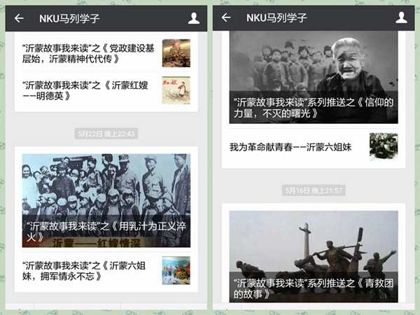 5月11日-25日,马院实践队依托“NKU马列学子”微信平台,开展“沂蒙故事 我来读”专题活动,陆续选编推出“沂蒙六姐妹”、“血战孟良崮”、“沂蒙红嫂—明德英”等近20篇沂蒙小故事,同学们结合故事畅谈读后感想。沂蒙故事选编推送旨在通过宣读革命故事,教育员工铭记革命传统,传承沂蒙精神。