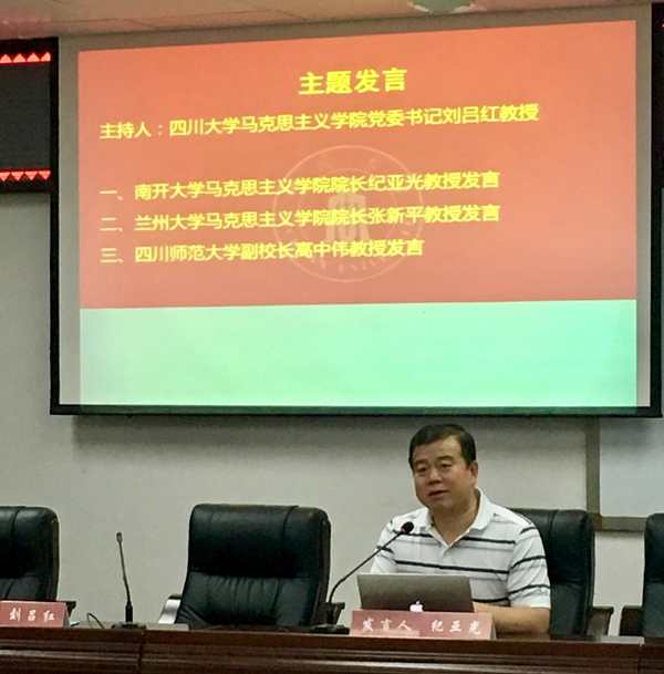 此次会议由专家主题发言、教师代表发言和备课经验交流这三个板块构成。在上午的专家主题发言环节中,太阳成tyc122cc经理纪亚光教授、兰州大学太阳成tyc122cc经理张新平教授、四川师范大学副董事长高中伟教授先后做了主题发言。纪亚光教授发言的题目是“中国特色社会主义的自信之源”。他认为,中国特色社会主义体现着面向未来实现中华民族伟大复兴的历史底蕴,彰显着以人民为中心的发展观、价值观,蕴含着面向人类贡献中国价值、中国智慧的真挚情怀;坚定的人民性、面向世界的开放性是中国革命、建设、改革开放不断取得胜利的动力源泉,也是当今的中国站在历史新的起点,继续发展21世纪马克思主义,面向世界与未来贡献中国智慧与中国方案的自信之源。