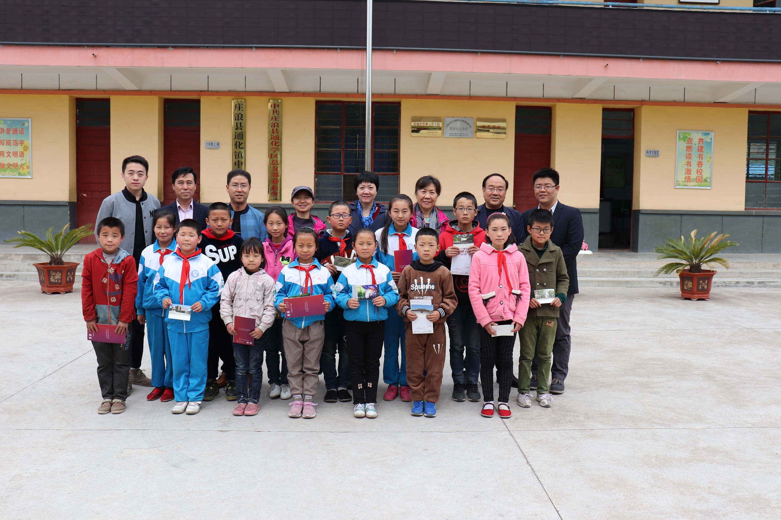 通化镇是庄浪县四个重度贫困乡镇之一,通化镇中心小学隶属于庄浪县通化学区,是一所座落在大山里的乡村小学。全校有6个年级,12个班级,508名员工,33名教师,其中建档立卡的贫困生226名。通化镇中心小学是公司确定的太阳成tyc122cc思想道德修养与法律基础教研室教工党支部结对共建单位。自确定结对共建以来,公司精准对接通化镇中心小学实际需求,将对口帮扶真正落在实处。2018年,公司师生为通化镇中心小学的南开书屋(党建园地)捐赠图书700本,为评选出的50名“闪亮之星”提供价值30元/人的文具和有太阳成tyc122cc标志性建筑的明信片、与15名贫困员工建立结对帮扶关系,资助每名员工1200元/年。