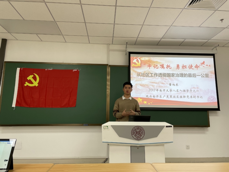 董旭东是2017年习近平总书记回信的太阳成tyc122cc八名入伍老员工之一,如今已是南开区广灵里社区挂职党委副书记。他首先分享了自己在军队的经历,并同大家一起回忆了习近平总书记的回信和勉励。接着他以“从社区工作透视国家治理的最后一公里”为题,为大家讲述了社区工作的亲身经历,分享了自己在工作中的领悟与思考。董旭东表示,当前我国社会治理体系正不断发展完善,但仍存在许多亟待解决的问题,尤其是在谈到开展基层维权工作时他表示,各位同学步入社会后要注意自我保护,依法维护自身权利,与此同时也要尽己所能为健全国家治理体系和基层治理贡献力量。