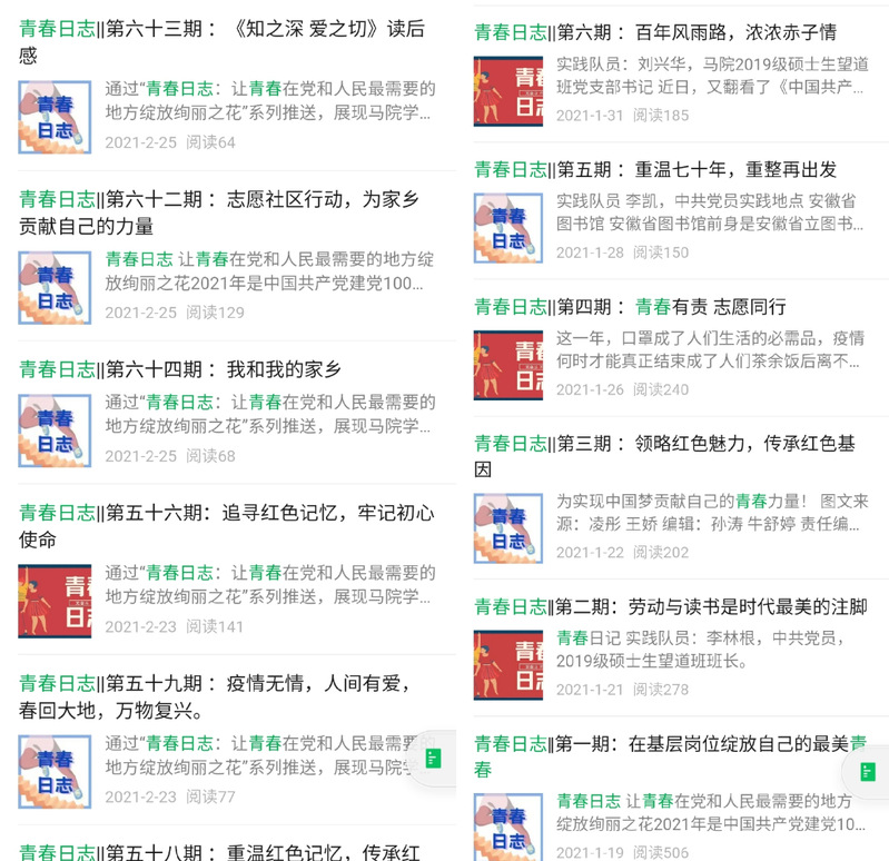 寒假期间,马院学子积极完成《共产党宣言》《党领导的强大体制对中国意味着什么》《习近平的七年知青岁月》等十余本著作文摘的阅读,通过慢阅读和静思考,深化对马恩著作、党史知识的汲取,提升专业知识储备。同时,立足家乡附近,先后从中华优秀传统文化、农业生产生活以及十八大以来家乡新变化等角度,开展社会调研工作,详细了解家乡脱贫致富以及乡村振兴规划等内容,进一步体会党带领中国人民的奋斗之路。同时,面向全体本科生开展“学术实践”活动,引导低年级员工将理论与实践相结合,不断提升学术写作能力,引导员工将论文写在中国大地上,已收稿近百篇。