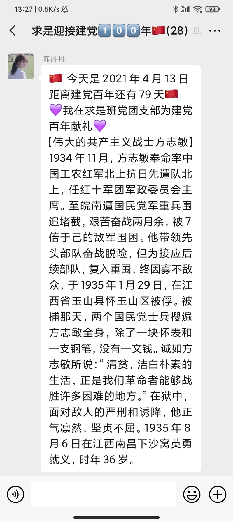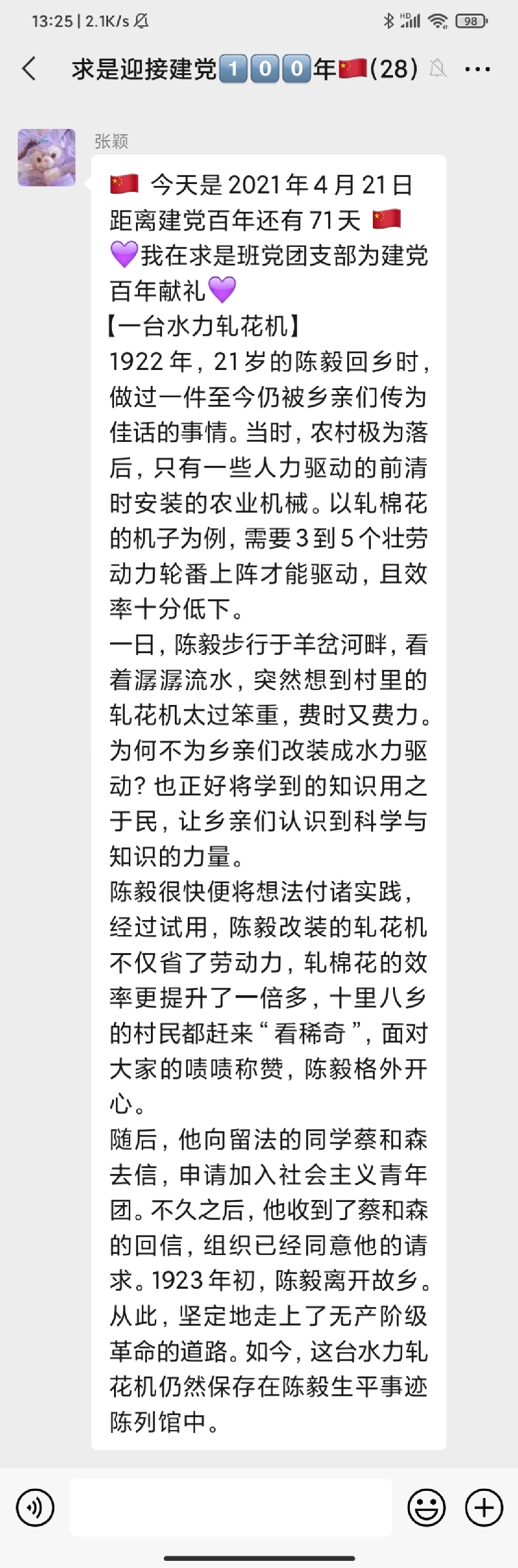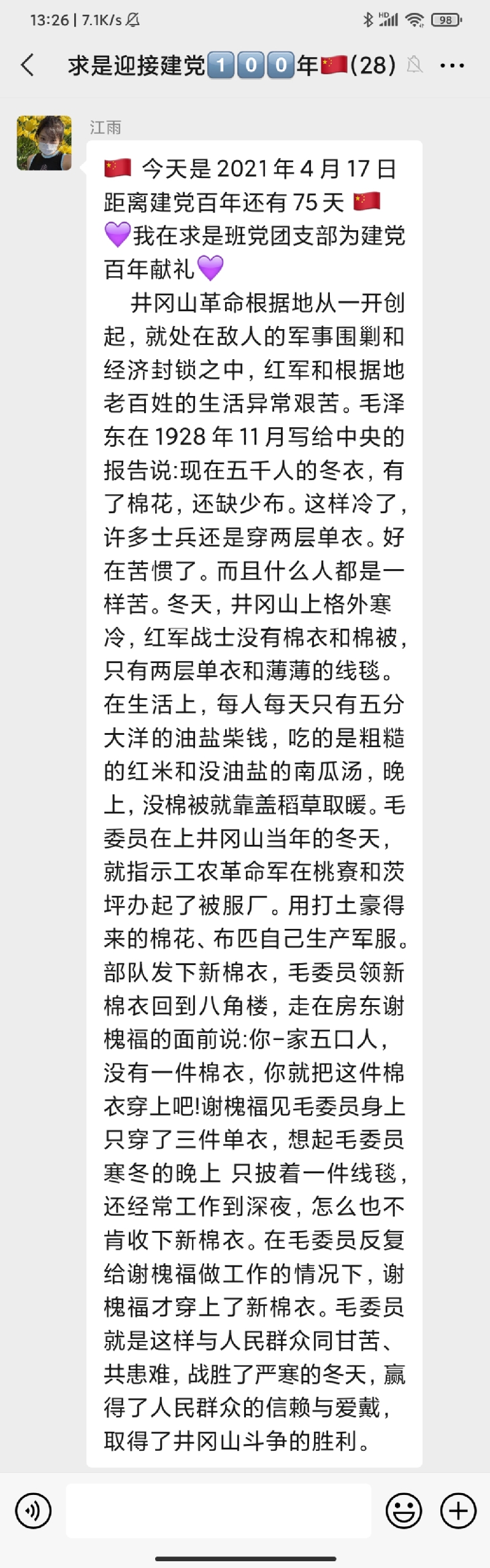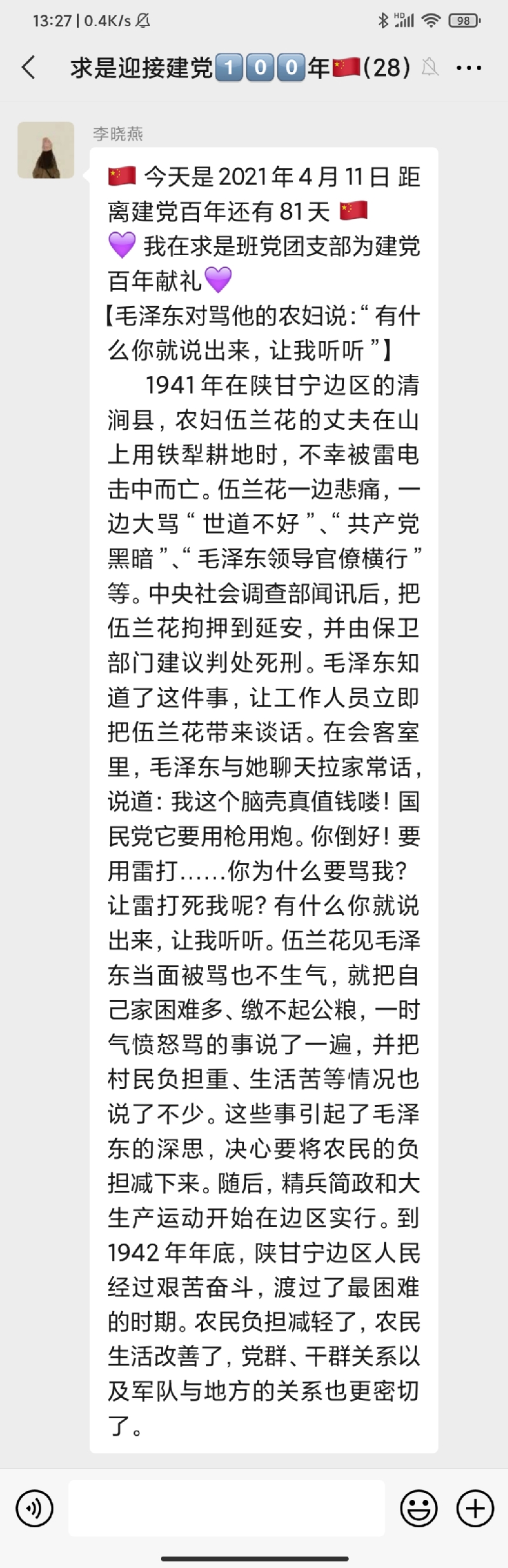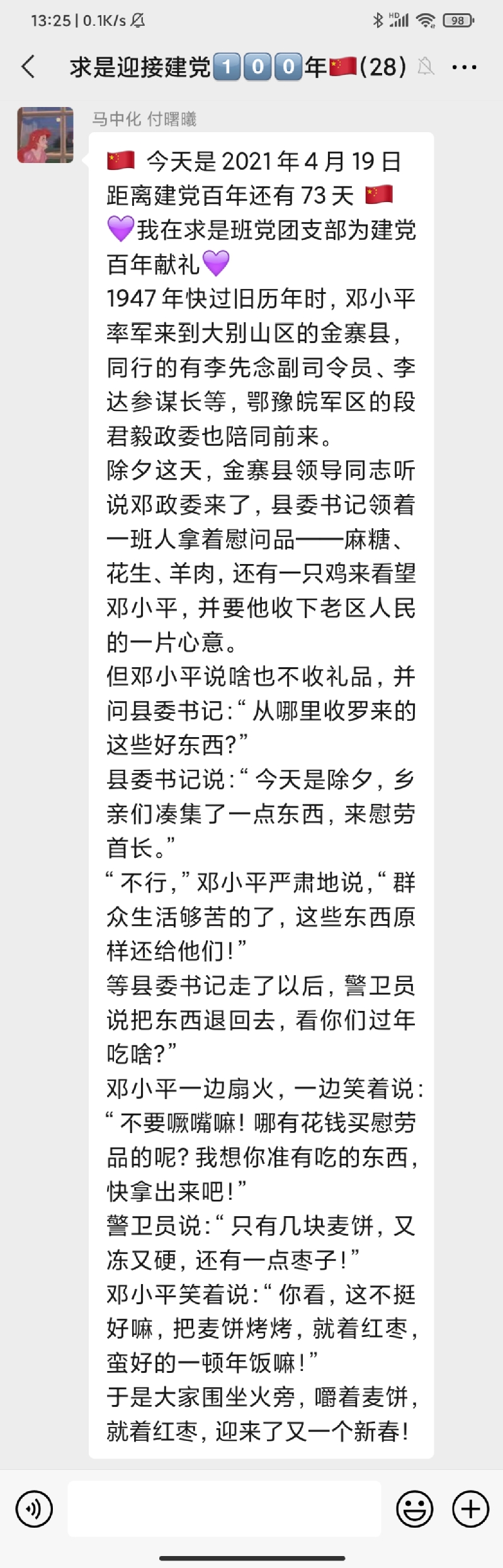 该活动自323日开展以来持续稳步推进,在求是班党团支部中引发了热烈反响,同学们表示,阅读每天的党史故事分享已经成为了睡前“必修课”。学习党史,不仅增强了同学们的知识储备,更让各位党员、团员同志了解了前辈的革命精神。求是班团支部成员付曙曦分享“邓小平在大别山区过新春”故事,让同志们进一步认识了共产党员联系群众的优秀作风。