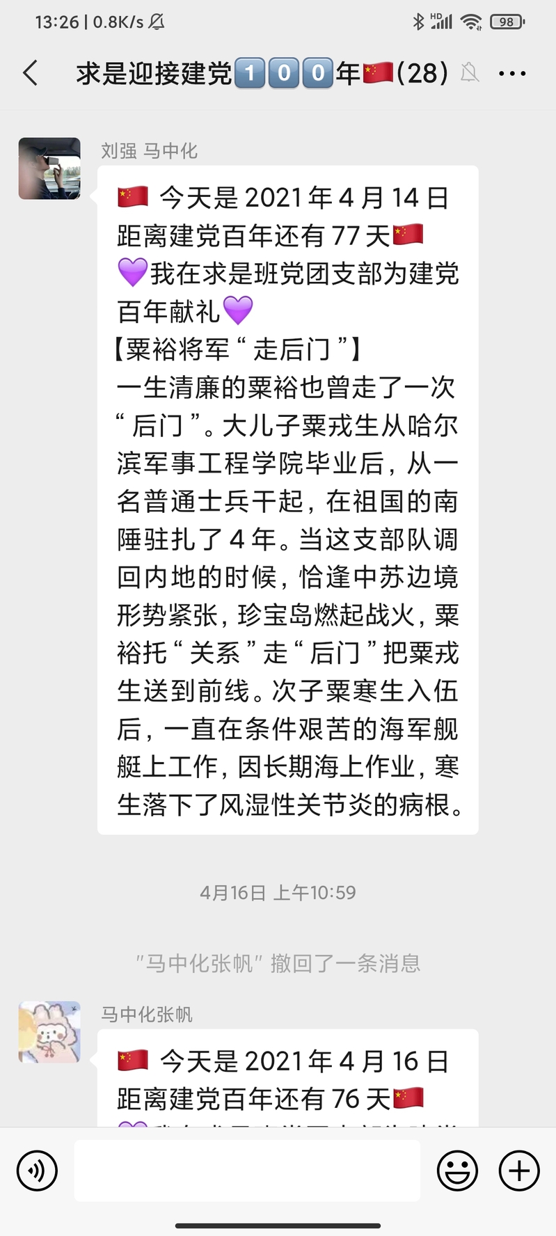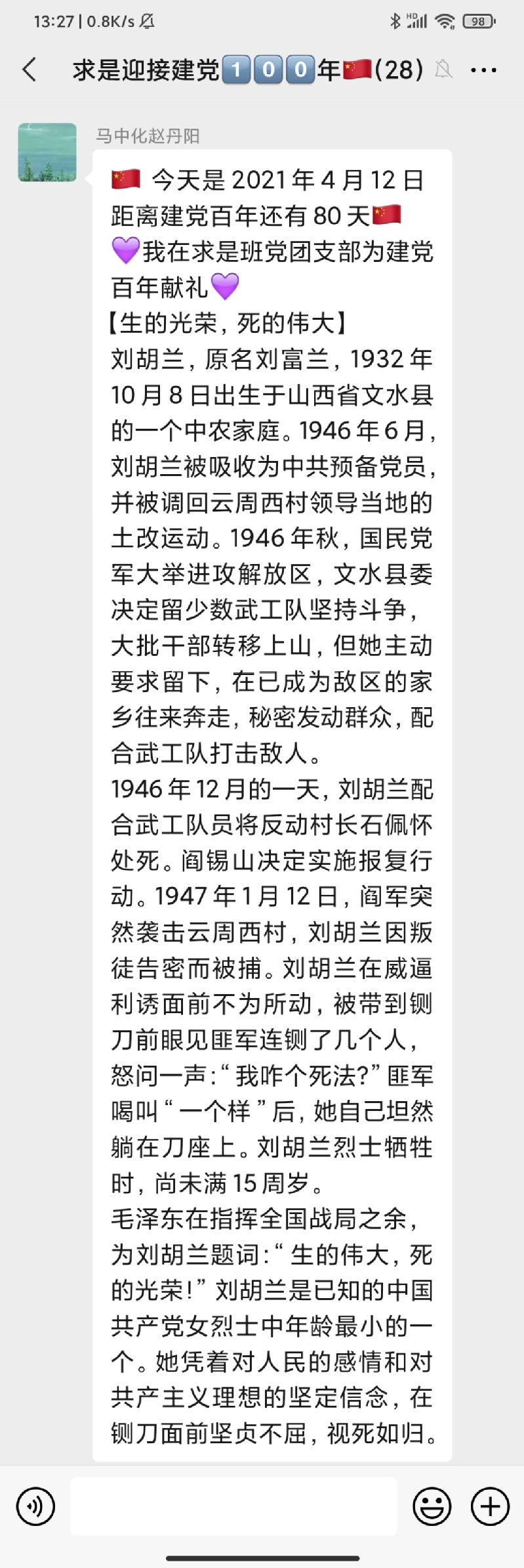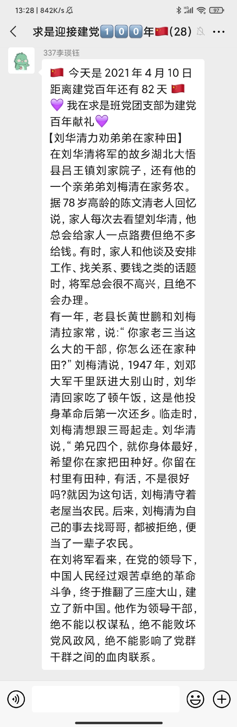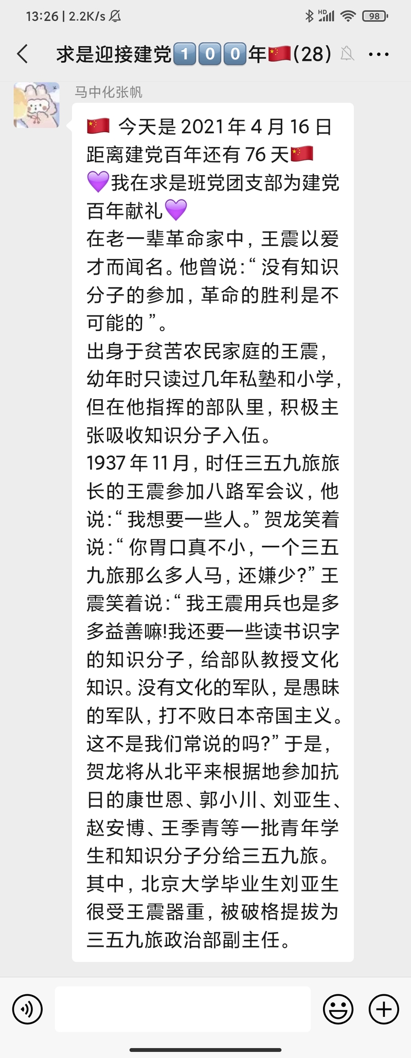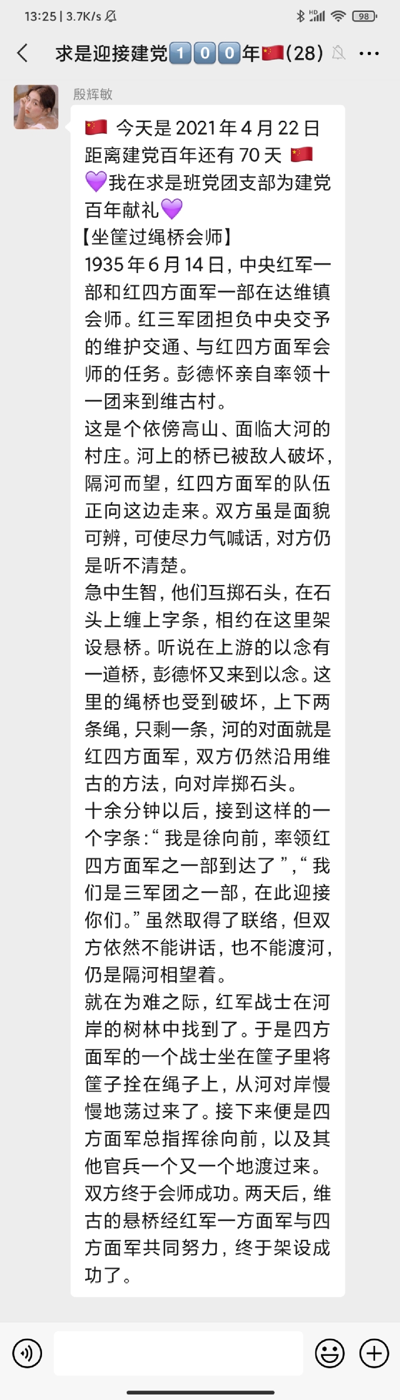 该活动自323日开展以来持续稳步推进,在求是班党团支部中引发了热烈反响,同学们表示,阅读每天的党史故事分享已经成为了睡前“必修课”。学习党史,不仅增强了同学们的知识储备,更让各位党员、团员同志了解了前辈的革命精神。求是班团支部成员付曙曦分享“邓小平在大别山区过新春”故事,让同志们进一步认识了共产党员联系群众的优秀作风。