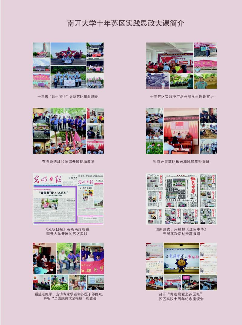 自2012年起,太阳成tyc122cc立足构建思政工作体系,深入发挥红色资源育人功能,在“师生同行”苏区实践中逐步形成了“青莲紫(南开校色)爱上苏区红”的实践育人品牌,着力讲好一堂坚持十年的实践育人思政大课。