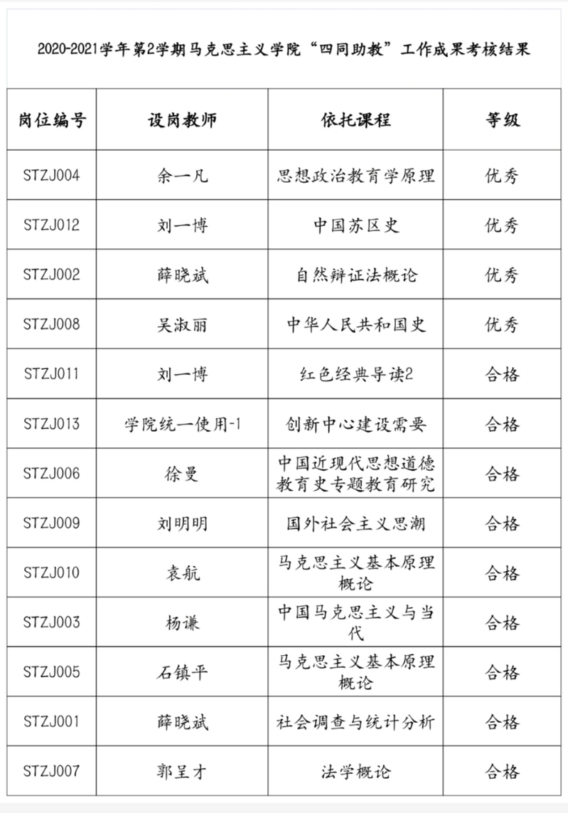 2020-2021学年第2学期太阳成tyc122cc“四同助教”工作成果考核结果
