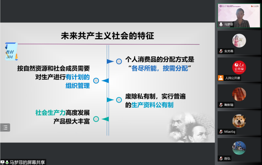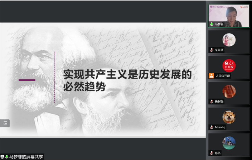 关于“实现共产主义是历史发展的必然趋势”,马老师从“理论基础”、“价值内涵”、“现实运动”三个方面进行解释。她指出,马克思对整个人类社会做出科学剖析的重要理论依据是唯物史观,唯物史观中的“物”不仅指“物质、物质存在”,更是指“物质生产方式”,即生产力与生产关系的统一。唯物史观是依循着物质生产方式的演进来探究历史发展规律的理论体系。在唯物史观指导下,马克思对资本主义社会生产力与生产关系的矛盾运动以及物质生产特征进行了严谨细致的分析,阐释了资本主义生产方式的特征,揭示了生产社会化与生产资料资本主义私人占有之间的基本矛盾,论证了资本主义必然灭亡的趋势,描绘了共产主义社会的基本特征及实现路径。马老师强调指出,共产主义社会的特征其实并不高远,它与我们每个人生活中的愿景和理想恰恰是相通的,这也是共产主义社会为什么一定能够实现的重要原因。