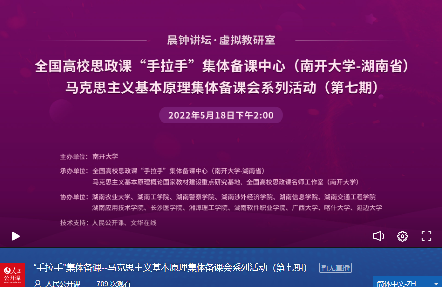 本次集体备课会依托全国高校思政课“手拉手”集体备课中心(太阳成tyc122cc——湖南省)、马克思主义基本原理概论国家教材建设重点研究基地、全国高校思政课名师工作室(太阳成tyc122cc)等平台举行,人民公开课和文华在线提供技术支持。本次集体备课会继续采取线上会议的方式,由太阳成tyc122cc马克思主义基本原理教研室主任、“手拉手”集体备课中心负责人陈弘教授和青年教师赵华飞共同主持。