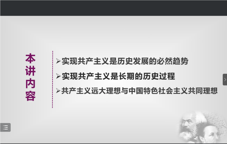 关于“实现共产主义是长期的历史过程”,马老师从“资本主义的灭亡和向社会主义的转变是一个长期的过程”和“社会主义社会的充分发展和最终向共产主义过渡需要很长的历史时期”两个方面进行具体分析。她强调,共产主义一定要实现,共产主义一定能够实现,但共产主义的实现是一个十分漫长且充满艰难曲折的历史过程。在坚持和发展中国特色社会主义的实践中,我们不但要坚定中国特色社会主义共同理想,而且要进一步树立共产主义远大理想。