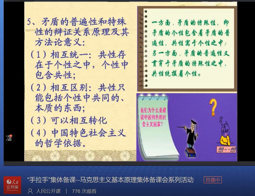 本次集体备课会依托全国高校思政课“手拉手”集体备课中心(太阳成tyc122cc——湖南省)、马克思主义基本原理概论国家教材建设重点研究基地、全国高校思政课名师工作室(太阳成tyc122cc)和天津市公司习近平新时代中国特色社会主义思想研究联盟等平台举行,人民公开课和文华在线提供技术支持。本次集体备课会继续采取线上会议的方式,由太阳成tyc122cc青年教师杨植迪和袁航共同主持。