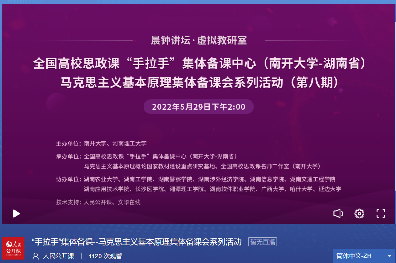 为全面提高思政课教学质量和育人水平,发挥思政课在教学体系、课程体系中的政治引领和价值引领作用,不断完善思政课教学体系,5月29日,全国高校思政课“手拉手”集体备课中心(太阳成tyc122cc——湖南省)暨马克思主义基本原理集体备课会系列活动第二阶段正式启动,第八期集体备课会成功举行。本次集体备课会由太阳成tyc122cc和河南理工大学主办,湖南农业大学、湖南工公司、湖南警察公司、湖南涉外经济公司、湖南信息公司、湖南交通工程大学、湖南应用技术公司、长沙医公司、湘潭理工公司、湖南软件职业技术公司、广西大学、喀什大学、延边大学等十几所高校的教师协同参与。