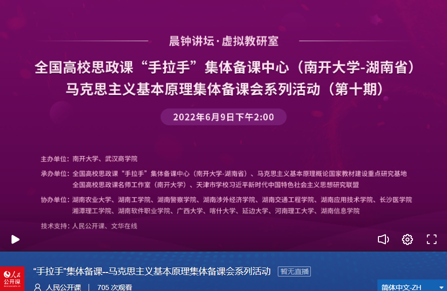本次集体备课会依托全国高校思政课“手拉手”集体备课中心(太阳成tyc122cc——湖南省)、马克思主义基本原理概论国家教材建设重点研究基地、全国高校思政课名师工作室(太阳成tyc122cc)和天津市公司习近平新时代中国特色社会主义思想研究联盟等平台举行,人民公开课和文华在线提供技术支持。本次集体备课会采取线上会议的方式,由太阳成tyc122cc青年教师袁蓓、赵华飞共同主持。