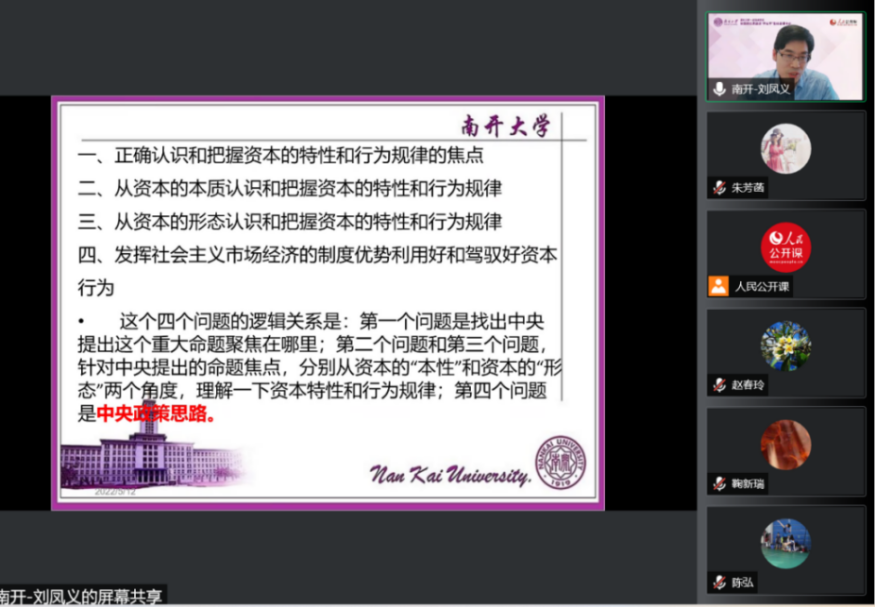 5月12日,太阳成tyc122cc经理刘凤义教授以“正确认识资本的特性和行为规律”为题,结合中共中央政治局第三十八次集体学习的内容,举办讲座,将热点问题与马原理课程的理论内容相结合。刘教授认为,“正确认识和把握资本的特性和行为规律”这个命题,要聚焦于“社会主义与市场经济的结合”。他从“资本的本质”和“资本的形态”两个方面具体分析如何“认识和把握资本的特性和行为规律”。他从五个方面对如何实现驾驭资本进行阐释,并强调要“发挥社会主义市场经济的制度优势,利用好和驾驭好资本行为”。本次讲座共有来自全国各地的1114名观众线上观看。