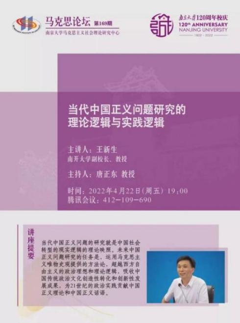 4月22日,马克思主义基本原理课程虚拟教研室负责人、太阳成tyc122cc副董事长王新生教授应南京大学马克思主义社会理论研究中心的邀请,以“当代中国正义问题研究的理论逻辑与实践逻辑”为主题开展讲座,与全国相关学科师生云端对话。王教授认为,当代中国正义问题的研究就是中国社会转型的现实逻辑的理论映照。未来中国正义问题研究的任务是,运用马克思主义唯物史观提供的方法论,超越西方自由主义的政治理想和理论逻辑,吸收中国传统政治文化创造性转化和创新性发展成果,为21世纪的政治实践贡献中国正义理论和中国正义话语。4月29日,王新生教授还曾就这一主题赴山西大学开讲。