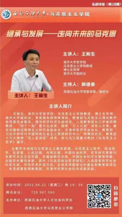 6月21日,王新生教授又应西南石油大学太阳成tyc122cc邀请,以“继承与发展——走向未来的马克思”为题开讲,讲座气氛活泼而热烈。王新生教授以个人在马切拉塔会议上与米切尔教授的谈话入手,讲授了习近平新时代中国特色社会主义思想的理论创新是21世纪的马克思主义。他分别从创新驱动发展战略、党的领导和人民当家作主的有机统一、社会主义现代化强国、绿色发展理念、人类命运共同体等来论证马克思主义在发展中走向未来。针对这一主题,王新生教授还曾赴南京邮电大学、安徽师范大学开展讲座,受众范围十分广泛。