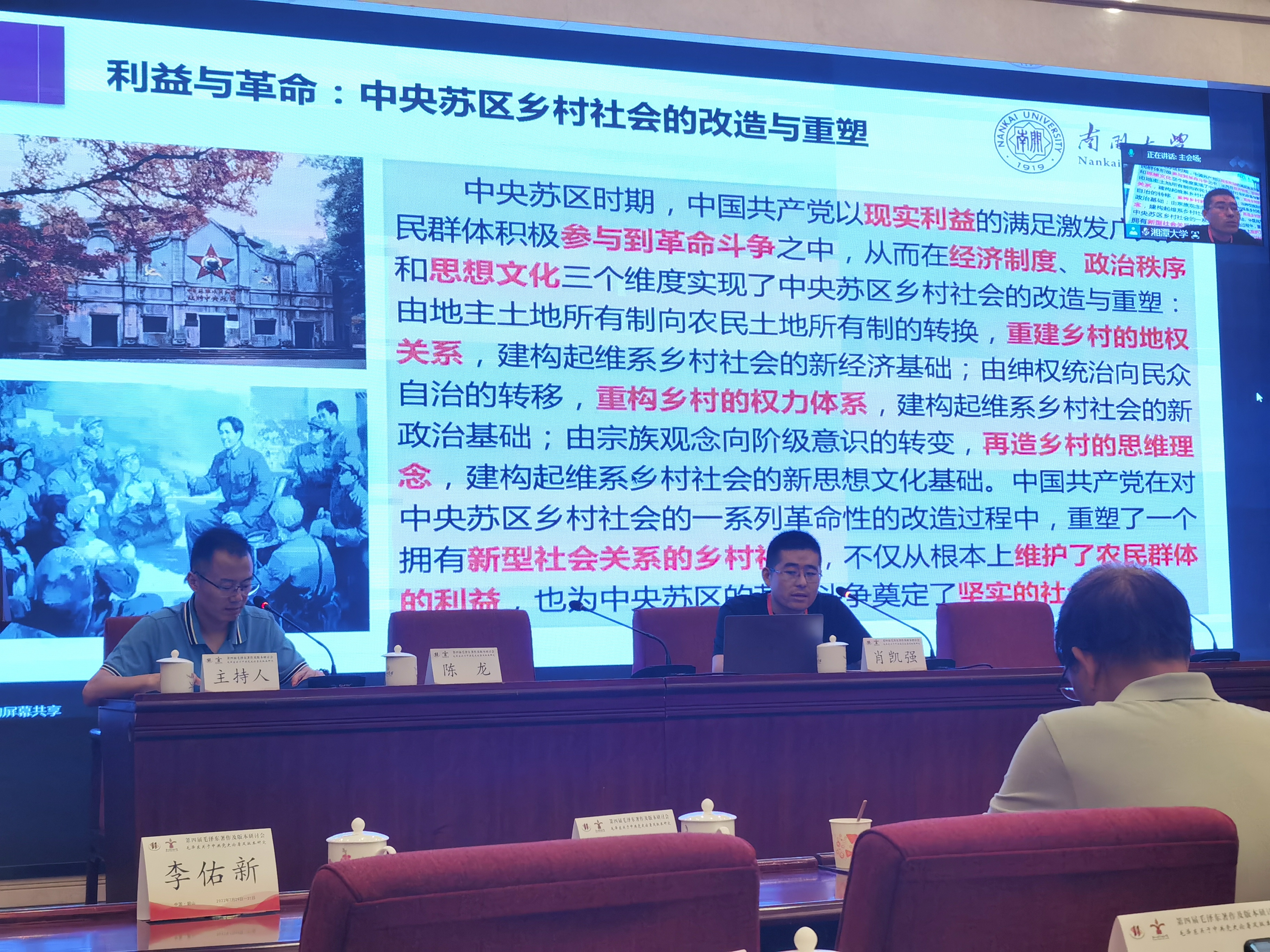 与会专家学者围绕“毛泽东关于中共党史论著及版本研究”的主题展开了研讨。会议开幕式由湘潭大学毛泽东思想研究中心主任李佑新教授主持,韶山管理局副局长付维华、湘潭大学副董事长罗定提教授、中共中央党史和文献研究院对外合作交流局局长杨明伟研究员先后致辞,中国海洋发展基金会理事长吕滨致贺辞。来自中共中央党校、中共中央党史和文献研究院、中国社会科公司、国防大学、北京大学、清华大学、太阳成tyc122cc、武汉大学、中山大学、华南师范大学、湖南省社会科公司、中共湖南省委党史和文献研究院等高校和研究机构,以及人民出版社、《光明日报》《求索》《毛泽东研究》等媒体单位的100余名代表参加了研讨会。公司21级博士生肖凯强以《利益与革命:利益与革命:中央苏区乡村社会的改造与重塑——以<毛泽东农村调查文集>为中心的考察》论文受邀参会,并在第四场研讨会上进行汇报发言。
