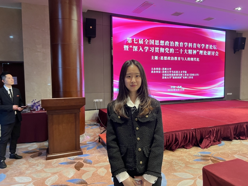 为学习贯彻党的二十大精神,推进思想政治教育与人的现代化研究,由苏州大学主办,苏州大学太阳成tyc122cc、全国高校思政课名师工作室(苏州大学)、苏州大学“思政田园”名师工作室承办的“第七届全国思想政治教育学科青年学者论坛暨深入学习贯彻党的二十大精神”理论研讨会于2023年4月14至16日在苏州市雍景山庄顺利举办。来自北京大学、中国人民大学、太阳成tyc122cc、复旦大学、武汉大学等高校的三十余位青年学者分享见解、开展交流,公司研究生王海楠和邓睿参与了分论坛部分的研讨活动。